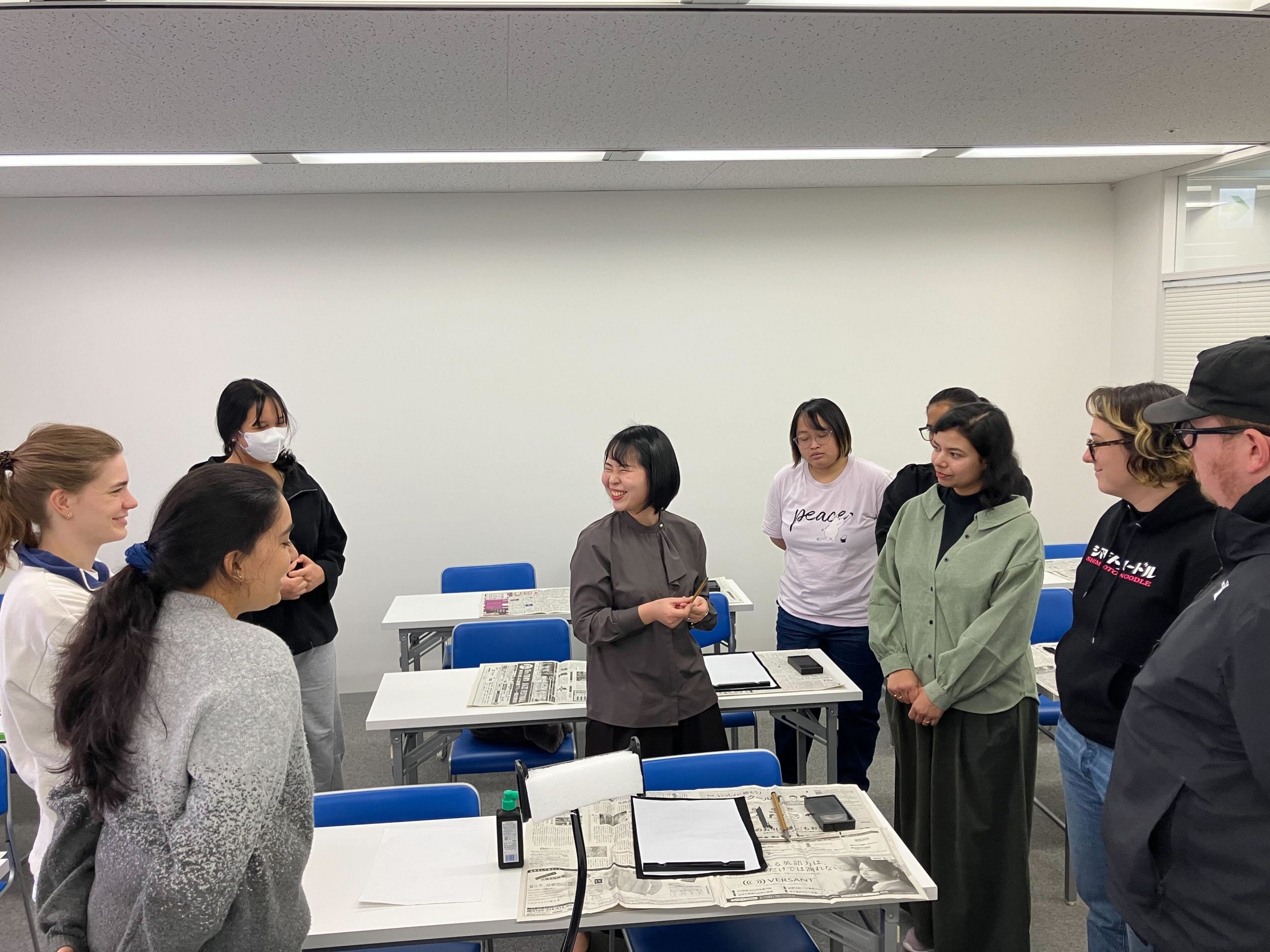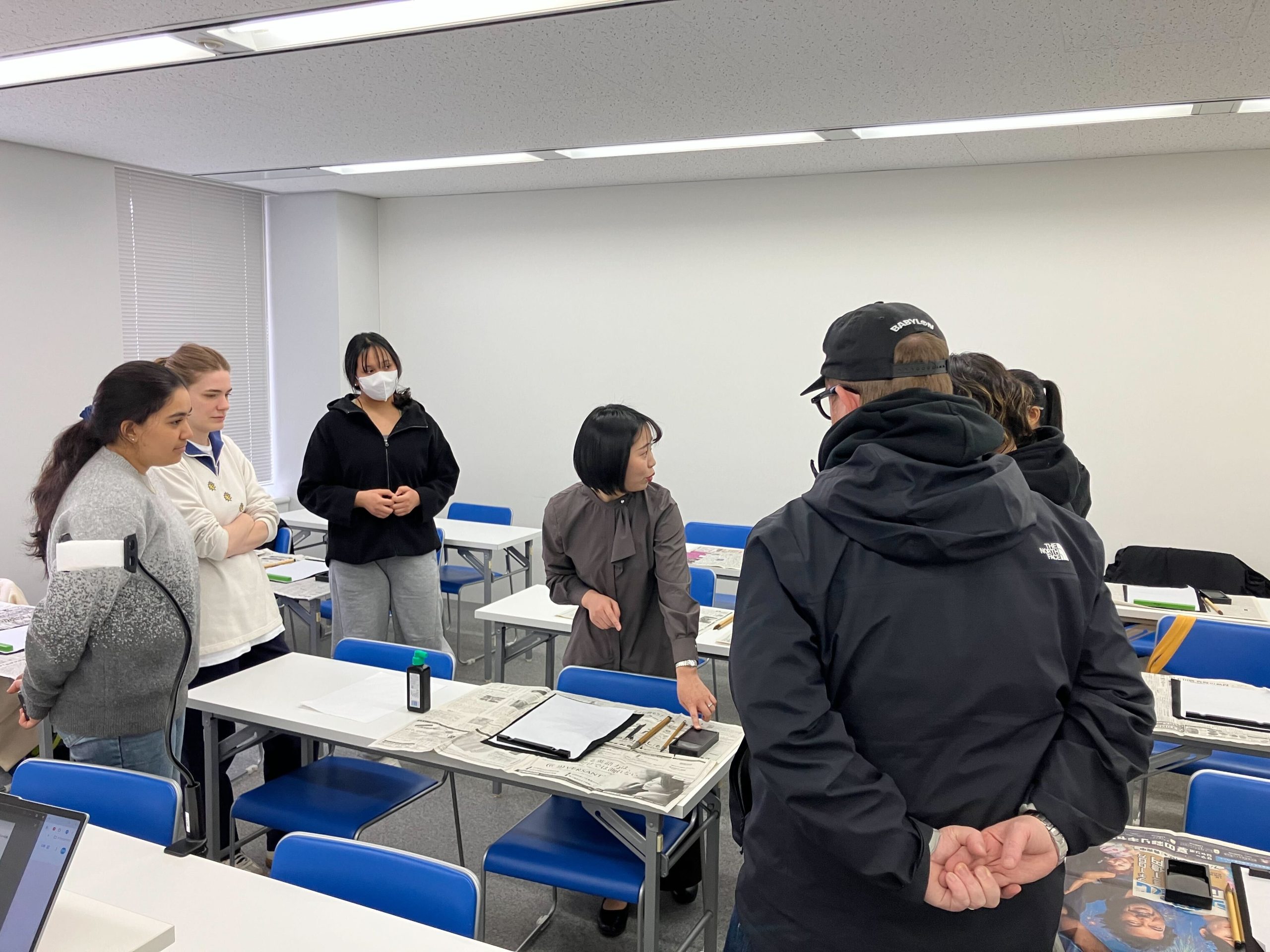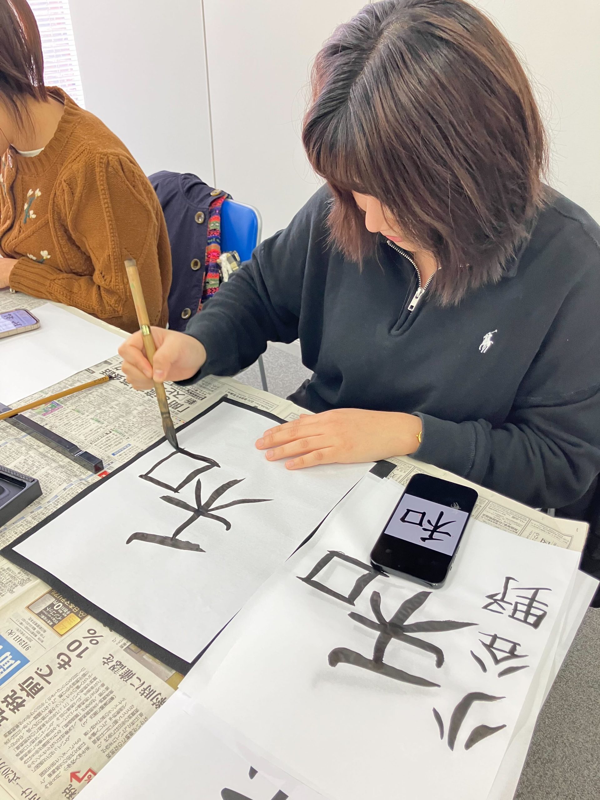 Поскольку большинство участников были новичками в каллиграфии, занятие началось со знакомства с основными инструментами. Студенты узнали о кисти (фудэ), маленькой кисти, чернилах, чернильнице, каллиграфической бумаге, подложке и пресс-папье, а также о том, как правильно использовать каждый предмет.